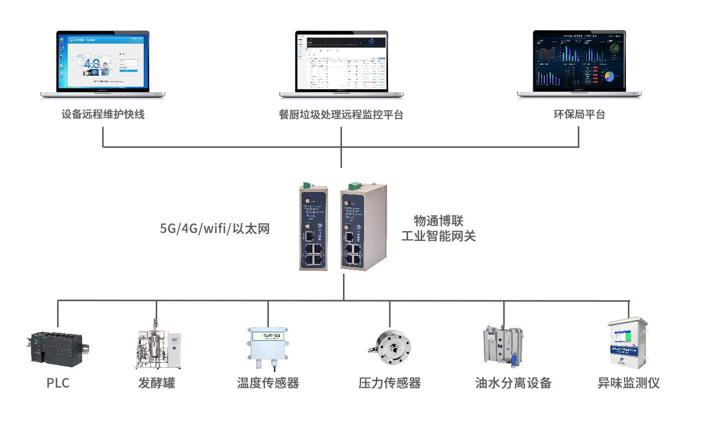 在餐廚垃圾處理設施中安裝傳感器和監測設備,通過物通博聯的工業智能網關采集處理設備(如發酵罐、油水分離設備等)的運行數據(如溫度、轉速、壓力等)、餐廚垃圾處理量數據以及異味排放數據。將采集到的數據傳輸至餐廚垃圾處理遠程監控平臺,平臺對數據進行實時分析和展示。當設備出現異常或異味排放超標時及時發出預警,對餐廚垃圾處理過程中的資源轉化(如油脂提取、沼氣產生等)進行評估,支持遠程運營管理和故障維修。