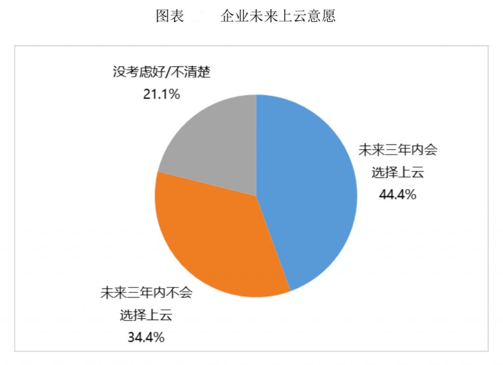 在沒有選用云服務(wù)的企業(yè)用戶中,超越40%的企業(yè)計(jì)劃在未來三年內(nèi)開端選用云服務(wù)模式,未上云企業(yè)依然存在比較強(qiáng) 的上云志愿,全體來看,我國企業(yè)事務(wù)上云還處于起步階段,未來的商場潛力巨大。