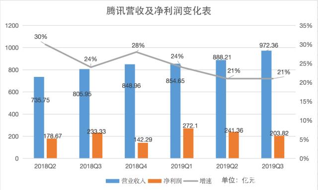 騰訊財(cái)報(bào)顯示,2019年第三季度營(yíng)收972億元,同比增長(zhǎng)20.6%,低于市場(chǎng)預(yù)期的990.4億元,增速與上季度持平;第三季度,公司股東應(yīng)占利潤(rùn),即凈利潤(rùn)203億元,同比下降13%,低于市場(chǎng)預(yù)期的235.3億元。