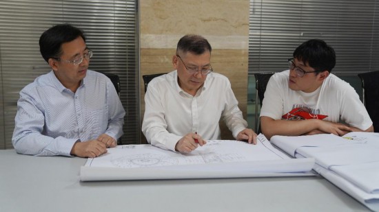 龔存忠(中)與團(tuán)隊(duì)研討技術(shù)方案。中國(guó)船舶集團(tuán)第七〇四研究所供圖