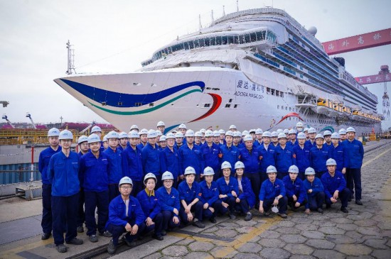 “愛(ài)達(dá)·魔都號(hào)”試航歸來(lái),郵輪項(xiàng)目部人員合影。外高橋造船供圖