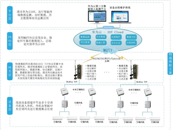通過 RS485、RS232、以太網等多種接口,物通博聯工業智能網關能連接新風設備控制器 PLC、溫濕度傳感器、空氣質量傳感器、風量風壓傳感器等設備,實時采集設備運行狀態、環境參數等數據。隨后利用 5G、4G、WIFI、以太網等通信方式,將采集的數據安全、穩定、高速傳輸至智慧樓宇管理系統中,為用戶提供可視化界面,實現設備遠程監控、數據分析、故障告警、遠程控制等功能。