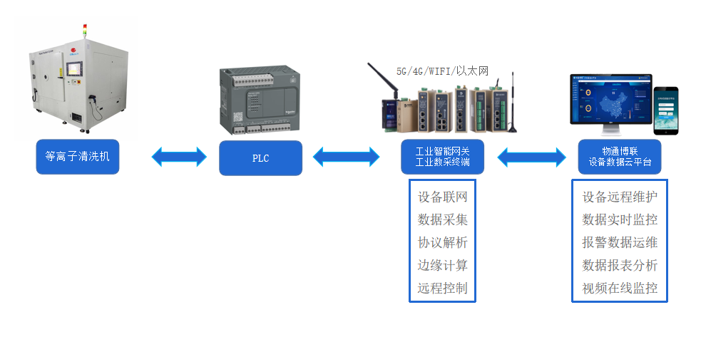 對此,物通博聯提供以工業智能網關為核心的等離子清洗機PLC數據采集遠程監控系統方案。通過將網關連接PLC,能夠實時采集PLC內部的各種數據,包括模擬量、數字量、開關量等,如等離子功率、氣體流量、真空度等參數。隨后以5G/4G/WIFI/以太網等方式對接到云平臺或上位機中,從而工廠、設備制造商制定決策提供全面可靠的數據支持。