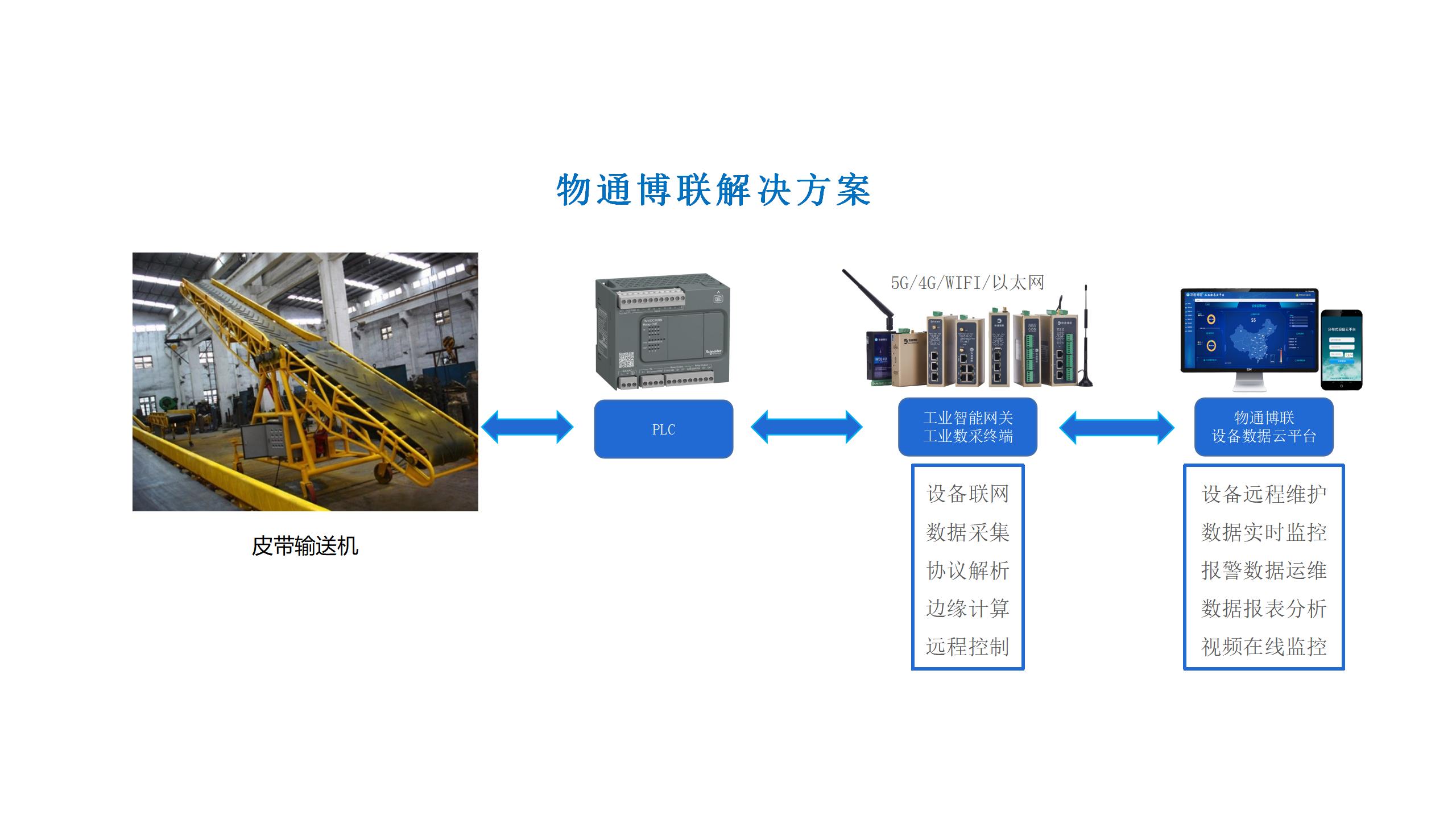 通過接入控制器PLC及告警燈,工業無線數采網關實時采集設備開關、電壓電流、是否告警等信息,并通過5G/4G等方式對接到監控中心平臺中,從而遠程監控全廠各處皮帶輸送機的告警狀態,并在出現異常時進行遠程控制啟停設備,避免出現意外事故。