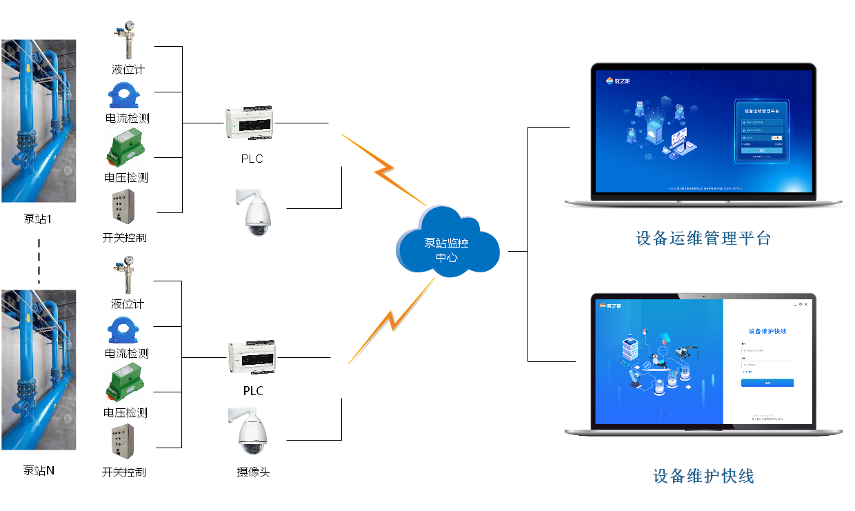現場多個污水泵已接入PLC實現自動化控制,因此將工業智能網關接入PLC即可從中采集數據,并實現以5G/4G/WIFI/以太網等方式對接到水廠管理平臺中,從而實現對各臺污水泵的集中監控、在線管理、遠程控制、故障運維與數據分析等功能,能夠有效提升設備運行穩定性與污水處理效率,保障污水處理廠的安全運營。