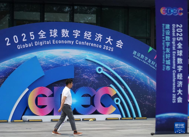 圖為參觀者從2025全球數(shù)字經(jīng)濟(jì)大會(huì)標(biāo)識(shí)前面經(jīng)過(guò)。新華社記者 張晨霖 攝