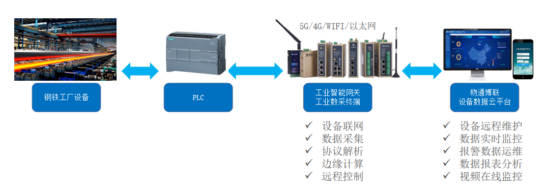 該系統選用工業智能網關WG583(三網口兩串口),通過接入控制器PLC,能夠實時采集設備參數并通過以太網對接到交換機中,隨后接入到監控服務器和本地大屏,實現對生產設備的集中監控與在線管理,從而加強管理水平與決策效率,促進生產安全穩定與可靠。